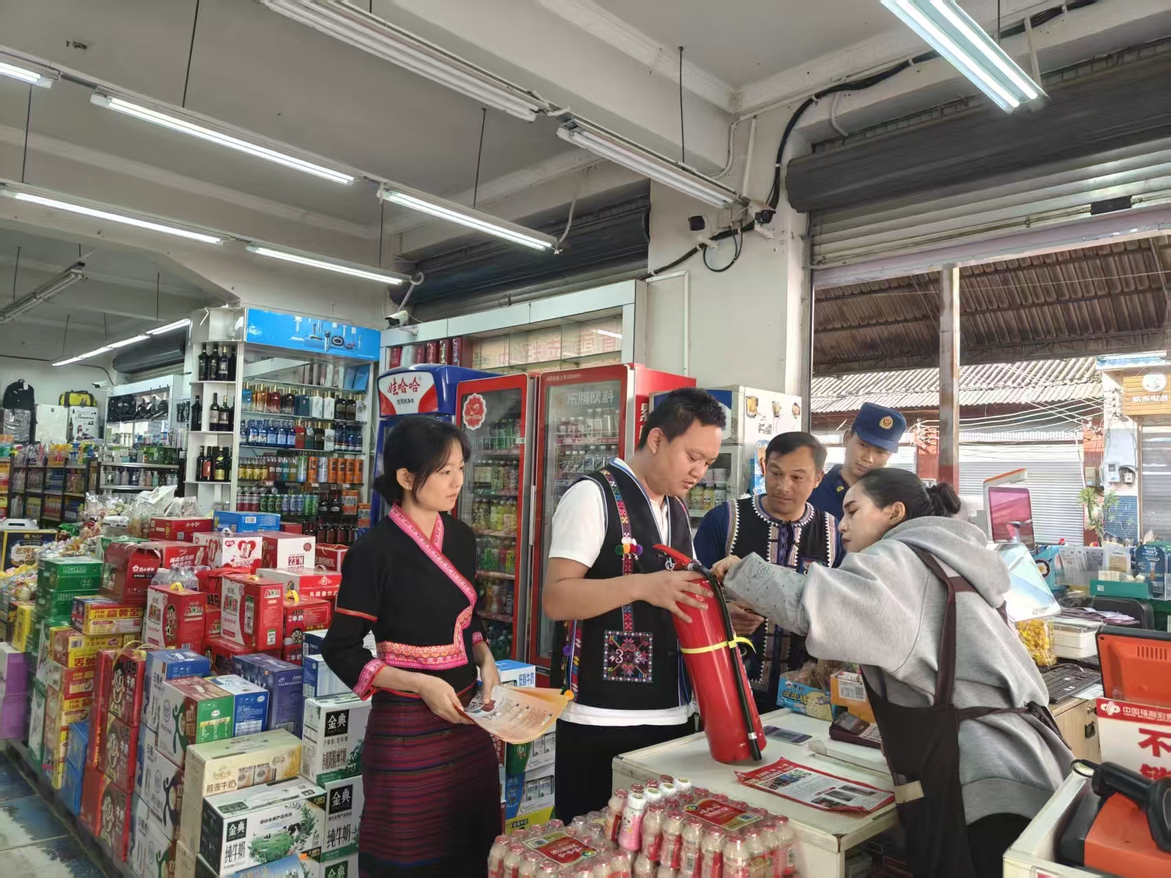 在沿街门店与农贸市场,宣传队伍推行“检查+宣讲”联动。志愿者用汉、彝、布朗等语言,结合典型火灾案例,解析电气老化、易燃物乱堆等隐患危害,手把手教商户掌握灭火器“提、拔、握、压”要领,现场协助商户整改私拉电线、通道堵塞等问题。同时发放宣传资料,强调“三清三关”要求,压实商户安全主体责任。