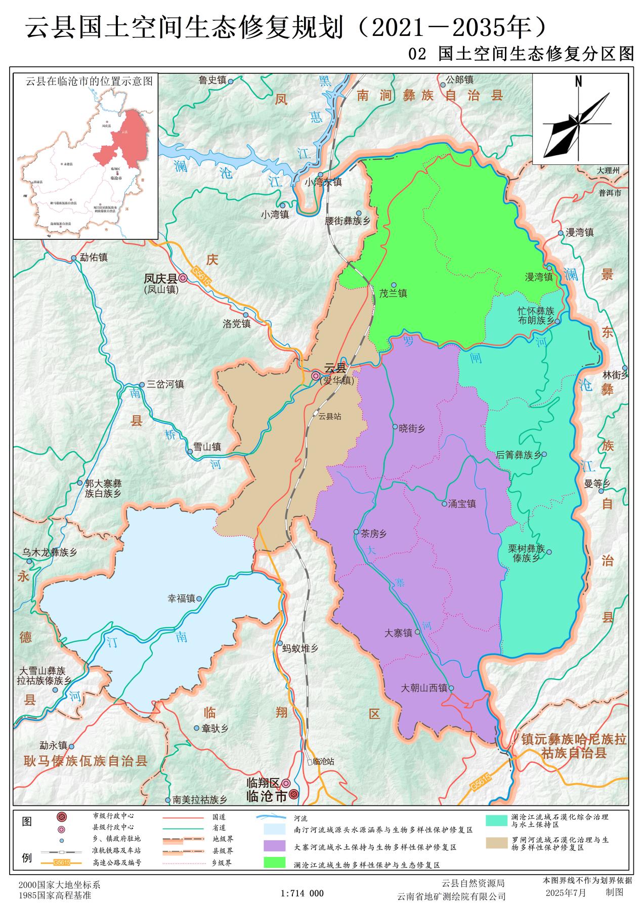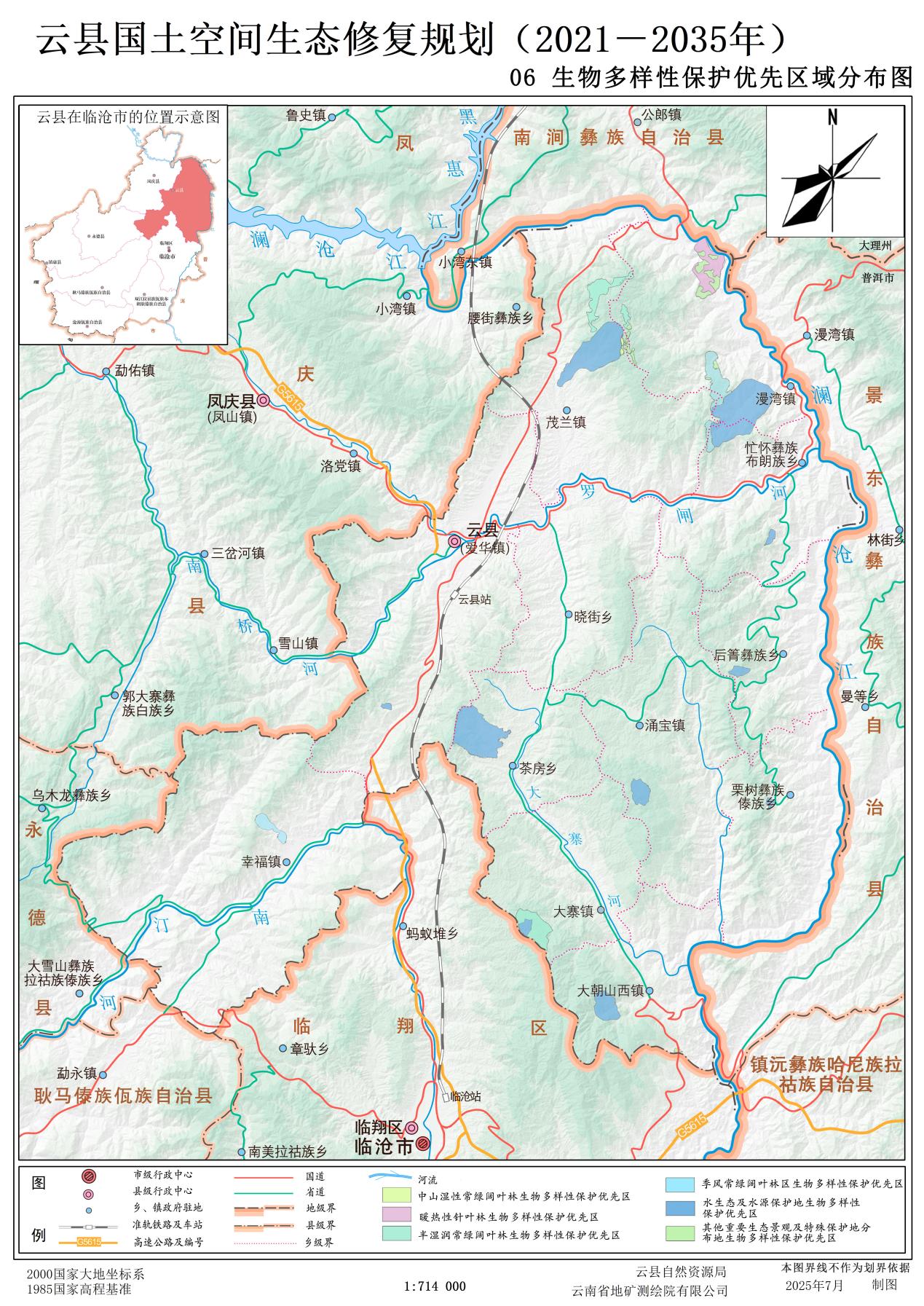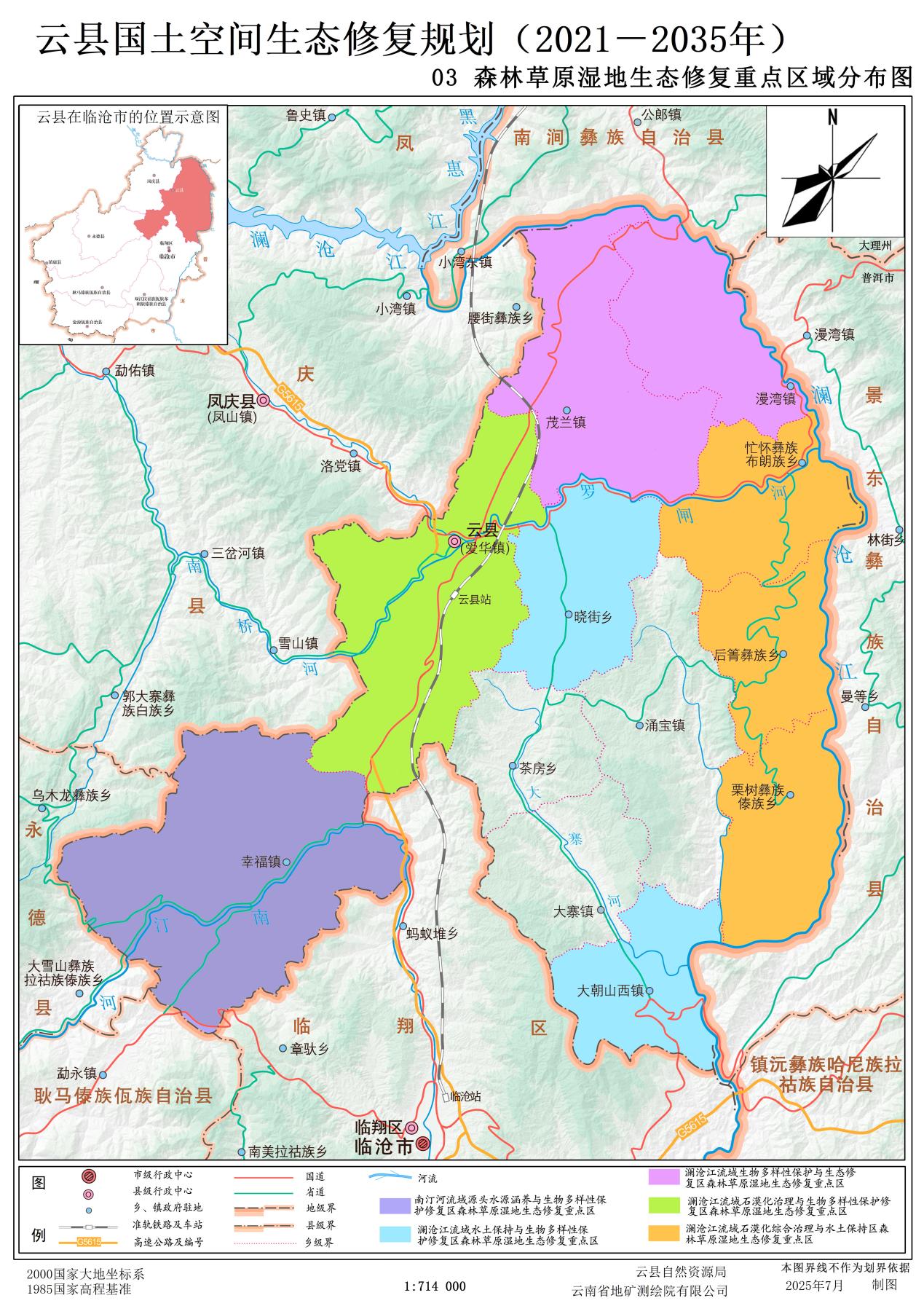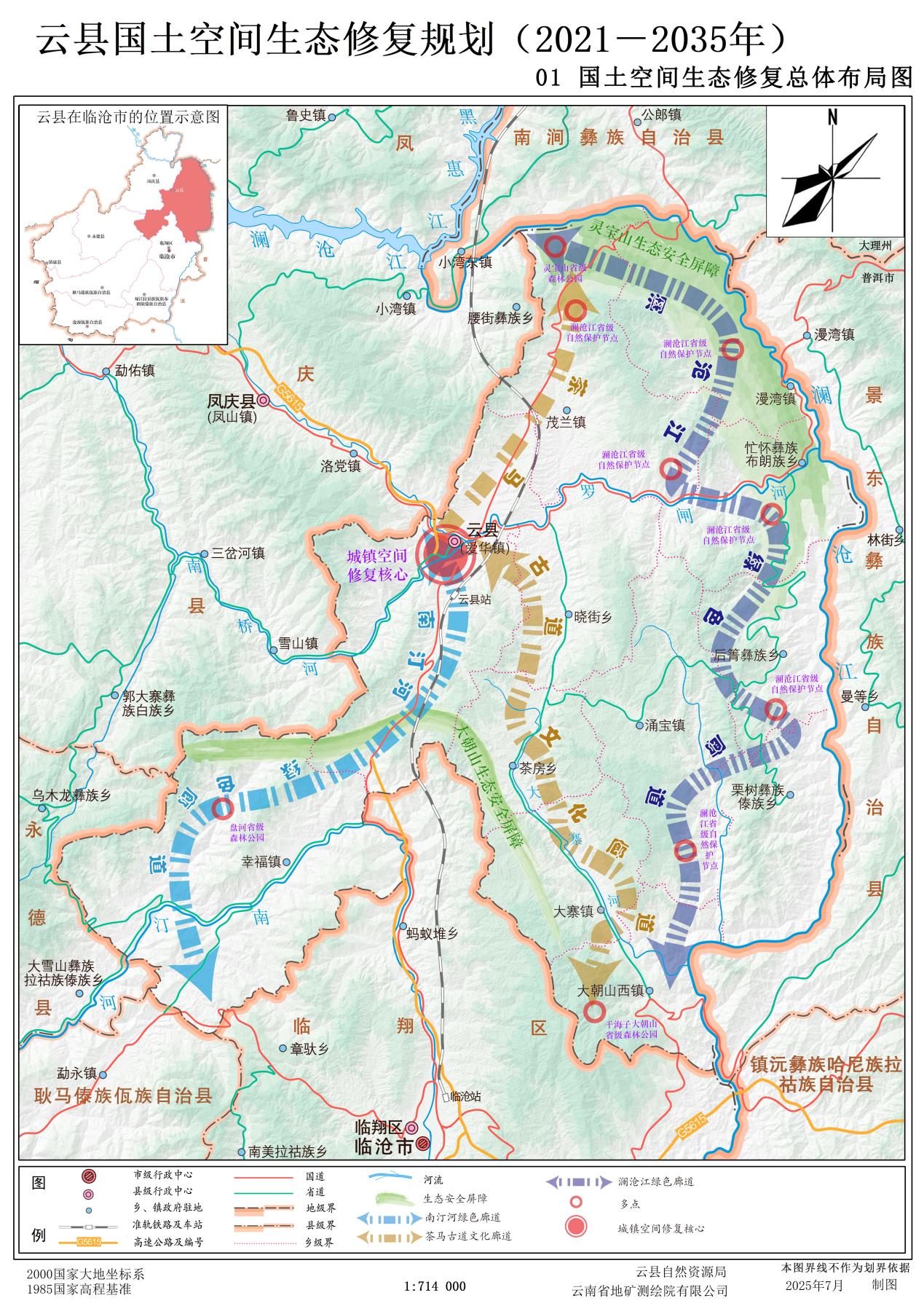 云县东隔澜沧江与普洱市的景东彝族自治县相望,南接临翔区、西北同凤庆县毗邻,西南与永德县、耿马傣族佤族自治县相连,北以澜沧江为界与南涧彝族自治县连接,属于澜沧江流域水土保持与生物多样性保护修复核心区域,肩负着维护临沧市乃至全省生态安全的重大职责。统筹全县国土空间生态修复,实施山水林田湖草沙系统治理,对全面筑罗扎河-澜沧江和哀牢山生态屏障,服务全县生态文明建设和高质量发展具有重大意义。
