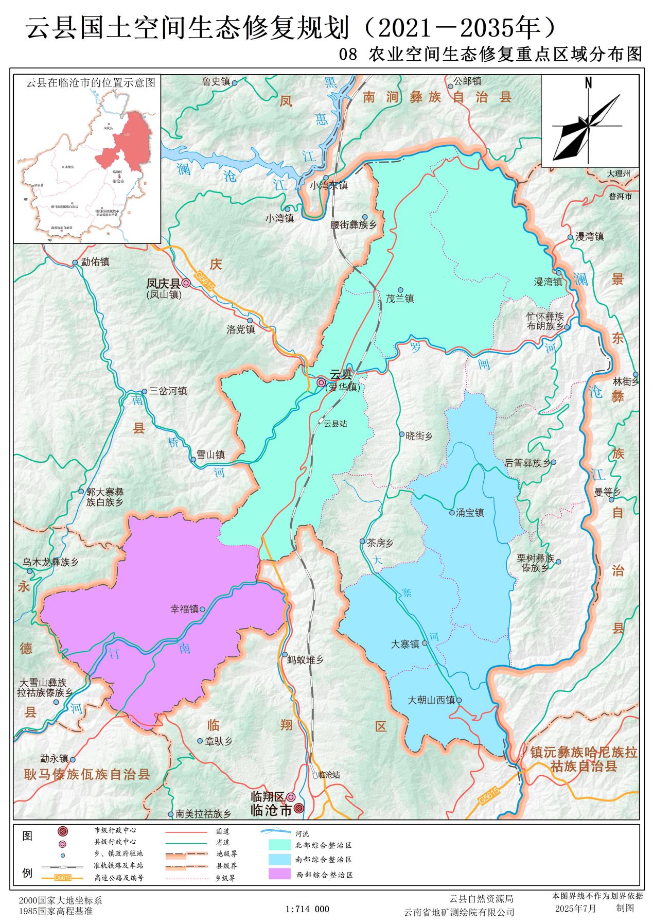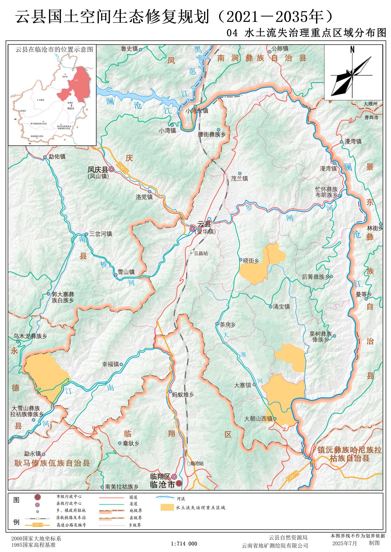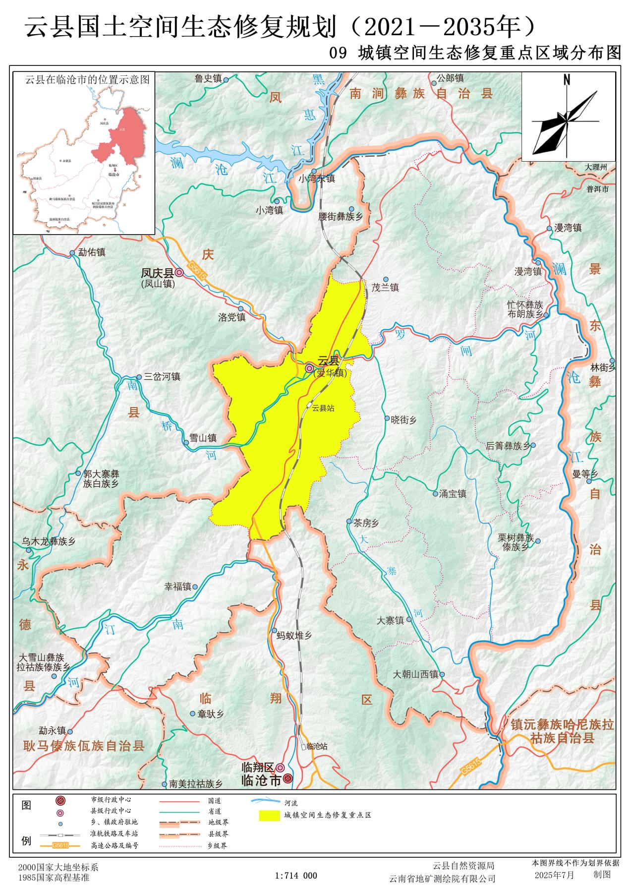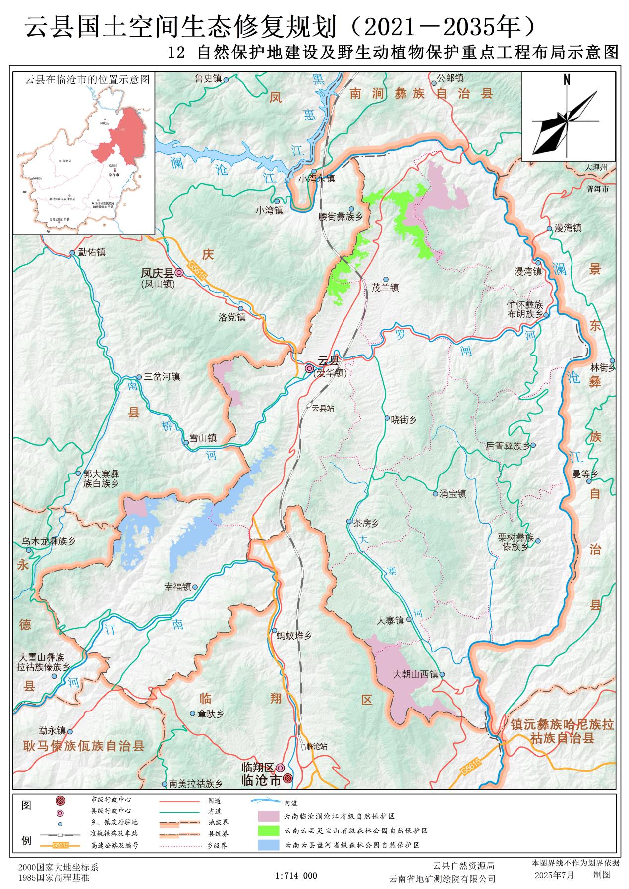 云县东隔澜沧江与普洱市的景东彝族自治县相望,南接临翔区、西北同凤庆县毗邻,西南与永德县、耿马傣族佤族自治县相连,北以澜沧江为界与南涧彝族自治县连接,属于澜沧江流域水土保持与生物多样性保护修复核心区域,肩负着维护临沧市乃至全省生态安全的重大职责。统筹全县国土空间生态修复,实施山水林田湖草沙系统治理,对全面筑罗扎河-澜沧江和哀牢山生态屏障,服务全县生态文明建设和高质量发展具有重大意义。