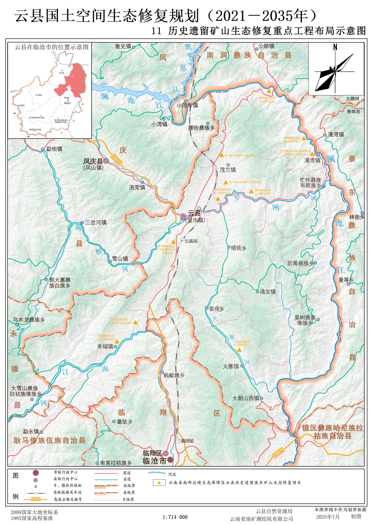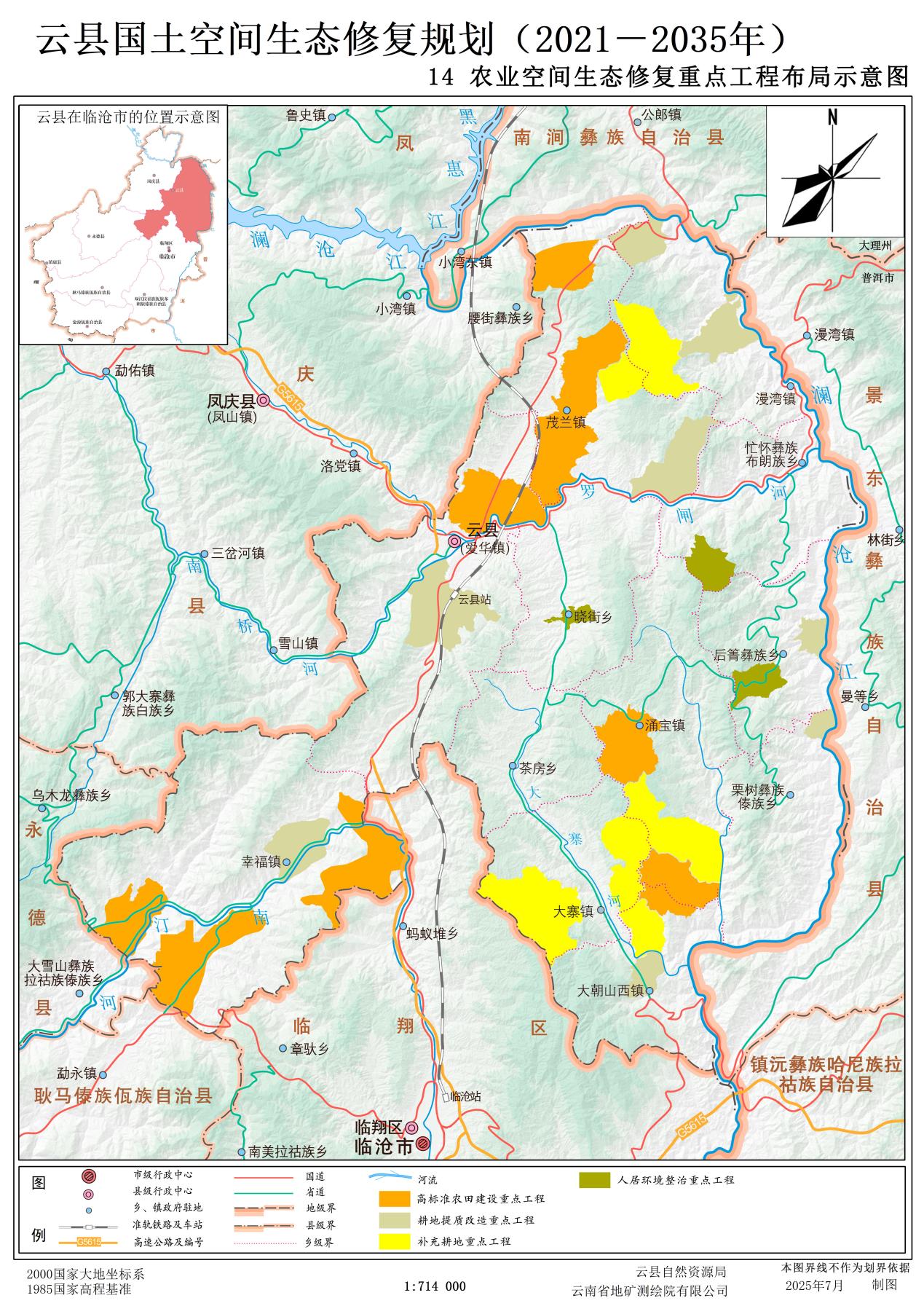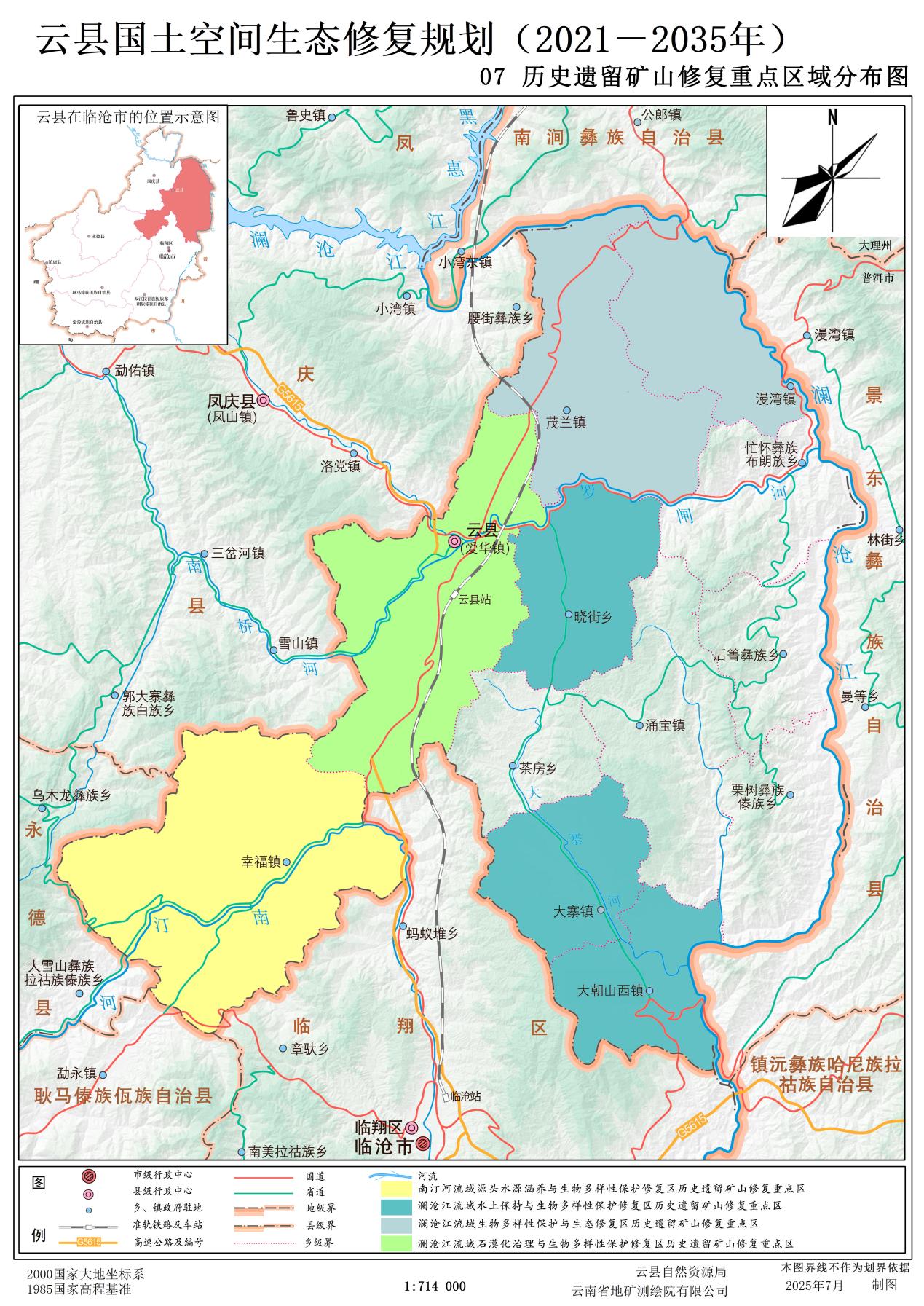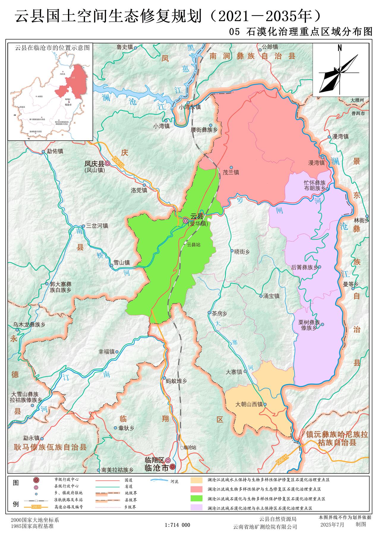 云县东隔澜沧江与普洱市的景东彝族自治县相望,南接临翔区、西北同凤庆县毗邻,西南与永德县、耿马傣族佤族自治县相连,北以澜沧江为界与南涧彝族自治县连接,属于澜沧江流域水土保持与生物多样性保护修复核心区域,肩负着维护临沧市乃至全省生态安全的重大职责。统筹全县国土空间生态修复,实施山水林田湖草沙系统治理,对全面筑罗扎河-澜沧江和哀牢山生态屏障,服务全县生态文明建设和高质量发展具有重大意义。