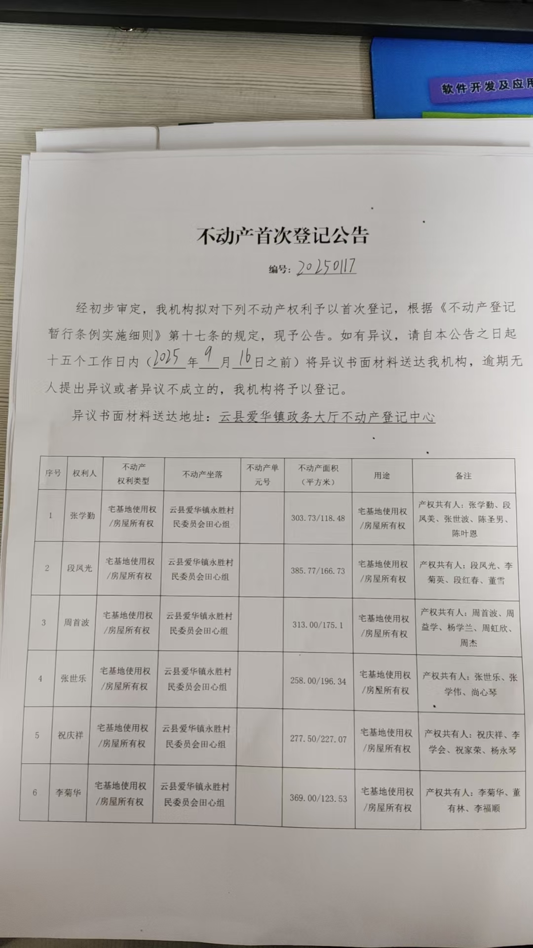 不动产首次登记公告(杨跃发等10户 20250120)